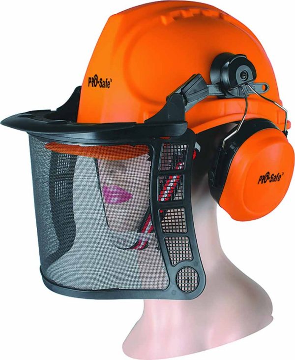Elmetto professionale da boscaiolo con visiera a rete rinforzata e cuffie antirumore di alta qualità