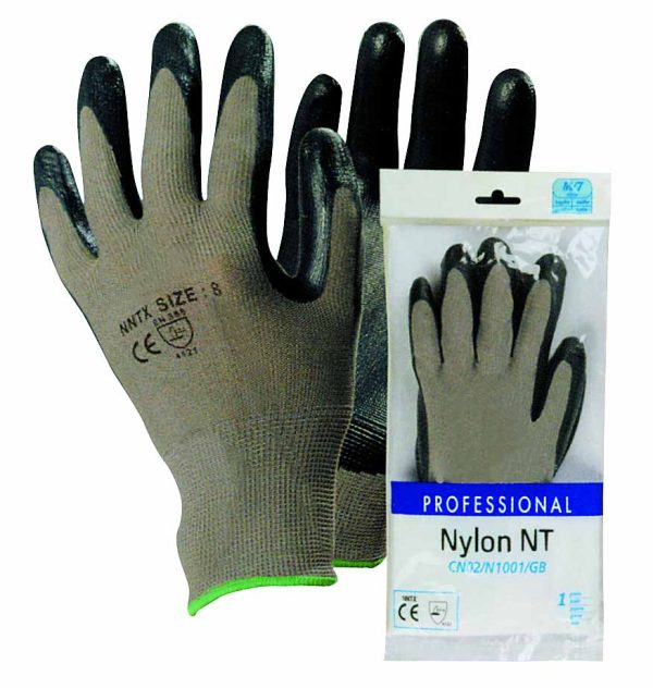 Rivestimento sintetico in NITRILE su palmo e dita, dorso areato, polsino elastico a tenuta con trama latex